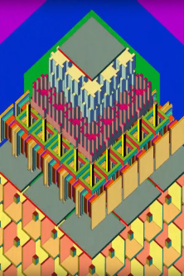 Animasi pendek dari Mirai Mizue. Figur sederhana dengan garis lurus berkumpul membentuk "kota" yang kompleks dan mengejutkan yang berdenyut seiring dengan skor hiperkinetik Scarlatti Goes Electro.